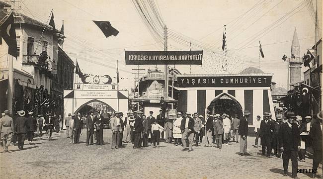 Adana’da bir Cumhuriyet Bayramı kutlaması. Yer Kemeraltı Cami civarı. Pankartta ‘Türk inkılabı asrı yıla sığdırdı’ yazıyor. Solda, Adana Ticaret ve Sanayi Odası’nın ‘Milli ticareti yaratan ve yaşatan Cumhuriyettir’ yazan tak ile yanında caddeye kurulmuş muhteşem ikinci bir tak yer alıyor.